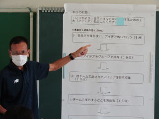 午前9時より職員を対象にした研修「働き方改革意識向上研修」を行いました。研修のテーマは「いつもより45分早く帰宅する工夫(アイデア)を考えよう!」。配付された付箋に各自で思いつくアイデアを書き出し、模造紙に貼り付けます。その後、カテゴリー別に分類します。その後、他のグループのアイデアを見て回り、再び、自分のグループ内で共有します。