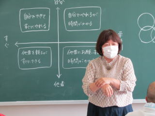 実技研修の後は、講義による研修です。実技研修で行ったことを振り返りながら、研修の意味と活用方法についてのお話をしていただきました。 |