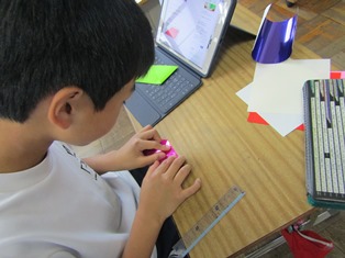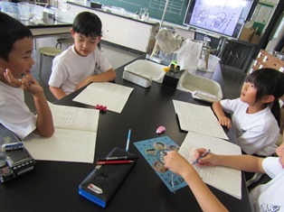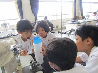 | 6月28日(水) 【2年1組: 算数科授業】 「目指せ!算数クイズ王~水っぽいもの編~」と題して、かさの学習に取り組みました。いろいろな形の容器に「1L」の水を注ぎ、同じかさでもいろいろな形に変わることを実際に目で見て、知ることができました。 友達と協力して作業をしたり結果について話をしたりと、グループでの活動が上手にできていました。 |