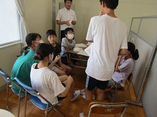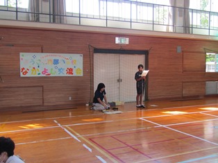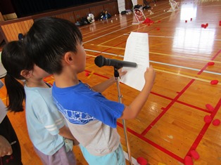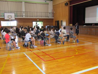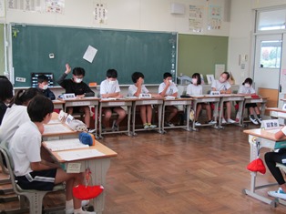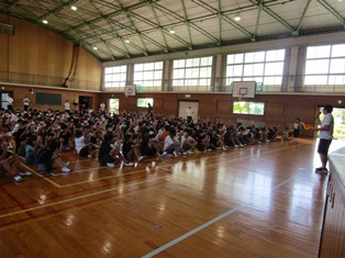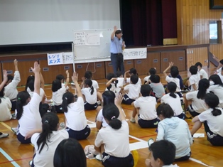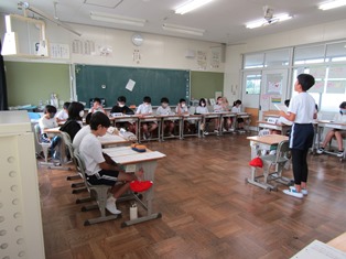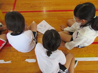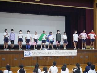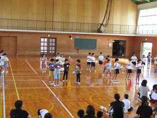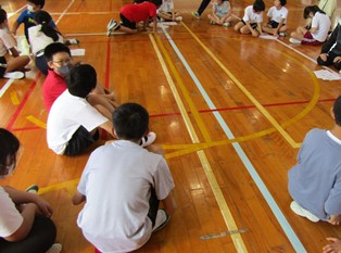 | 9月13日(水) 【5年生: なかよし交流】 この日は、三好特別支援学校の友達を本校に迎え、なかよし交流会が行われました。今回は学級ごとに内容を考え、1組の考えた「しりとり」と2組の考えた「なんでもバスケット」をやりました。みんなが楽しめるように、いろいろな工夫がされていました。 |