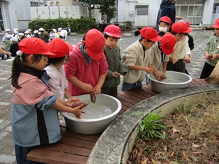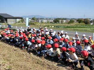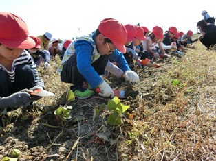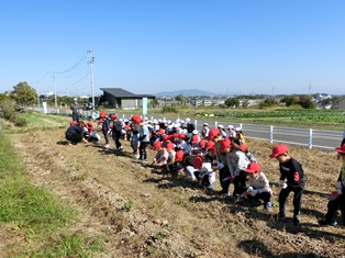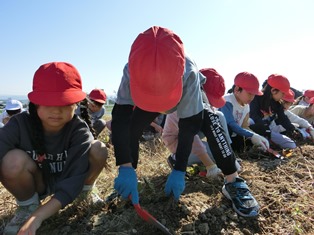 | 11月1日(水) 【1・2年生: いもほり】 気持ちの良い青空の下、1・2年生がサツマイモほりに出かけました。土を一生懸命に掘って、サツマイモが見えた時には、歓声があがりました。自分たちの顔よりも大きなサツマイモもありました。今日収穫したサツマイモは、11月15日に焼き芋にする予定です。 |