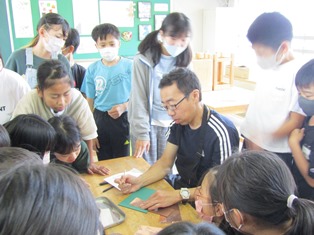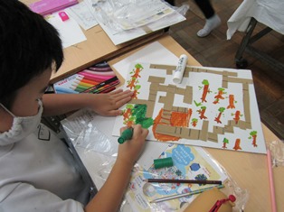 | 11月6日(月) 【芸術の秋です】 今日は、6年生が「150周年記念碑作り」を行いました。東海学園大学の小島先生に、教えていただき「銅板レリーフアート」を一人一枚ずつ作りました。今日教えていただいたことをもとに、6年生は、1年生の作品作りのお手伝いをします。頼りにしていますよ。 3年生の教室では、図画工作科の時間に「迷路作り」をしていました。色とりどりの作品ばかりで、見ているだけでわくわくしてきました |