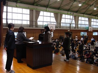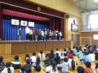 | 2月19日(月) 【朝会】 今日の朝会では、2つの表彰が行われました。 はじめは、書き初め大会。選ばれた子全員の名前が呼ばれ、金賞を受賞した児童に、校長先生から賞状が渡されました。 次の表彰は、2月17日に行われた、2024川淵三郎杯争奪第25回みよし市学校対抗サッカー(U-12)大会。サッカー部の選手たちは、最後まであきらめずにボールを追いかけ、戦い抜き、敢闘賞をいただきました。 |