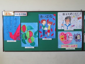 | 10月26日(月) 渡り廊下に掲示された子供たちの作品です。1年生から6年生まで、学習の足跡を掲示してあります。 |