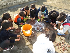| 11月18日(水) 温かい日差しの中、6年生がマテバシイの皮を割って、中の実を取り出す活動を仲良く行っていました。4年生は秋の生き物を探したり、春植えたツルレイシがどうなっているか観察したりしました。 |