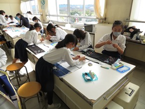| 11月26日(木) 5年生は家庭科の授業でエプロン作りです。アイロン、ミシン、手縫いなど、今まで学習したことを使って取り組んでいます。分からないところは教え合いながら協力して素敵なエプロンができるように頑張っています。色々な器具を使うので、家庭科室に入る前と後は手指の消毒を行っています。 |