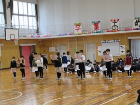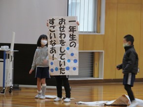 | 3月2日(火) 6年生の卒業を祝う「旅立ち集会」を行いました。1年生から5年生までが6年生に感謝の気持ちを込めて出し物を行いました。5年生が中心となって企画運営した旅立ち集会に、6年生もうれしそうでした。全員が入場しての集会は密になるため、発表するときのみ体育館に入り、他の時間は教室で体育館の様子を見てお祝いしました。 |