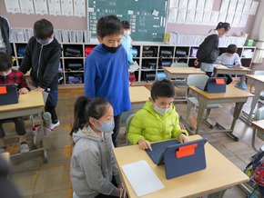 | 3月5日(金) 5年生がプログラミングしたゲームを2年生が一緒に楽しみました。5年生に優しく教えてもらって楽しそうにゲームをする2年生を見てうれしそうな5年生。2年生にとっても5年生にとっても有意義な時間となりました。 |