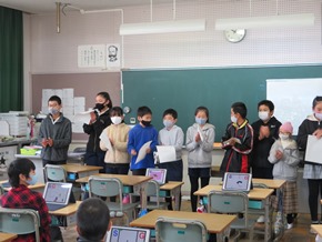 | 3月11日(木) リモートで全校集会を行い、その中でたくさんの児童が表彰を受けました。校長室で礼儀正しく校長先生から賞状を受け取ると、教室で見ていた児童から大きな拍手が起こっていました。今日は東日本大震災から10年目にあたります。各教室では担任の先生から震災の話を聞き、放送が流れると全員で黙とうをしました。 |