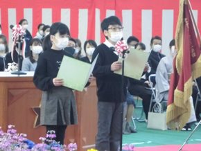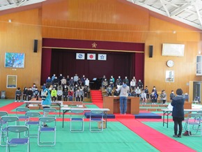 | 3月24日(水) 修了式が行われました。校長先生から修了認定があると、どの学年からも元気の良い返事が校内に響きました。その後、児童代表が今年頑張ったことを発表し、校長先生と保健の先生から話があり、みんな真剣に聞いていました。その後、各教室では通知表等が担任の先生から一人一人に渡されました。明日から春休みです。 |