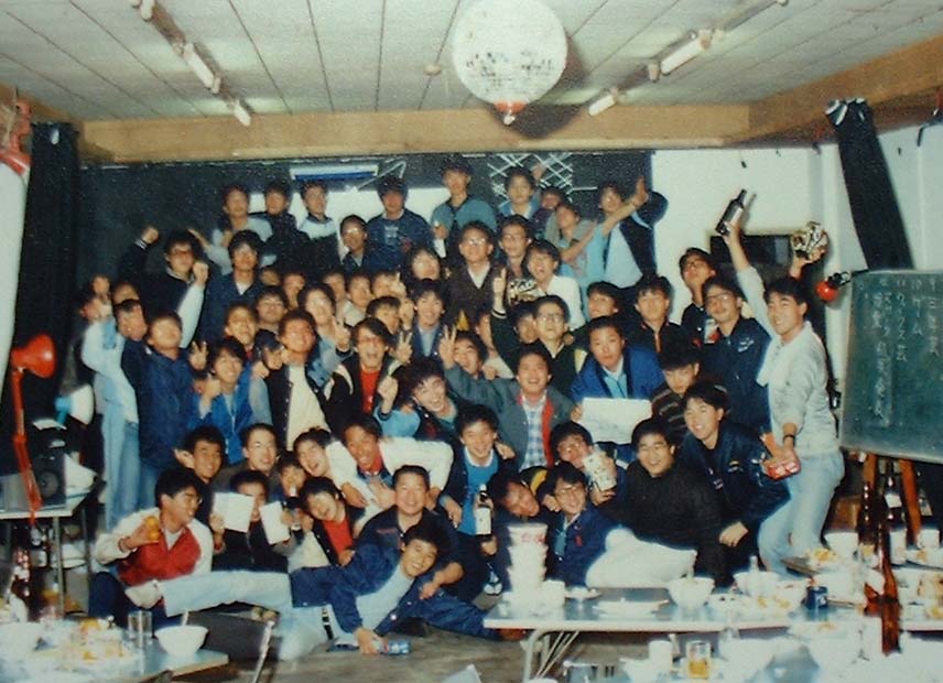 | 昭和60年寮祭 | 寮祭時の大宴会直後の 写真。テンションが高い のはみんな大酒のみ です。 しかし、どんぶりで日本 酒の一気なんて、絶対に やめましょうね。 |