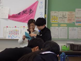 | 養護教諭の石﨑先生が卒業を間近に控えた3年生に、この時期恒例の成長を確かめ喜び感謝する授業を各クラスで行いました。生徒のみなさんは、石﨑先生とこれまでの成長を1人1人確かめ合い、先生に励ましの言葉をもらいました。成長記録には、小学校1年~中学校3年の義務教育9年間で伸びた身長分の長さのリボン飾りが付けてありました。級友とお互いの成長を照れくさそうに確かめ合う姿を見て、ほっこりした気持ちにました。 | ||