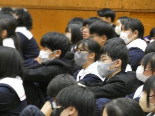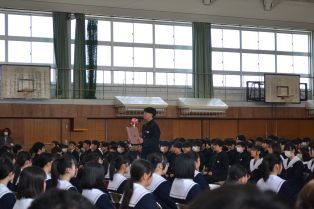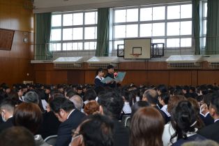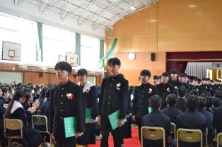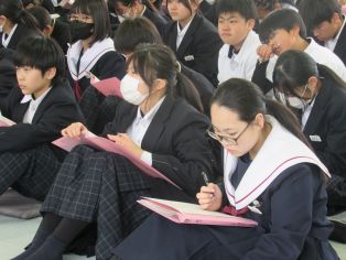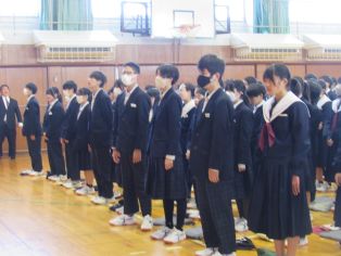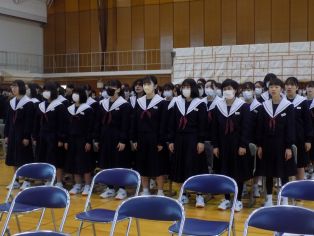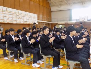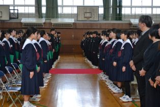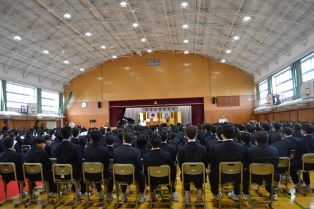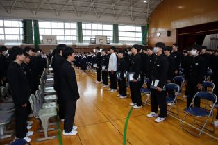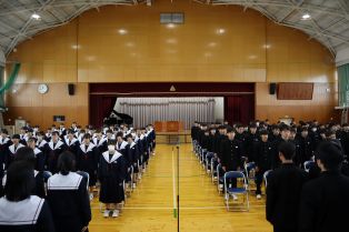 | 3月に入り、卒業式の練習が熱を帯びてきました。卒業生は、「歴代最強・最高の感動的な式」を在校生は「卒業生にあたたかさが伝わる式」を目指し、真剣に練習に取り組んでいます。会場の体育館に向かうために廊下に整列するところから引き締まった表情で準備している様子から真剣さが十分に伝わってきます。式の練習では、証書をもらったり、代表の生徒の言葉や歌を歌ったりする以外は、多くの生徒が指示に合わせて起立、礼をするだけでほとんどの時間、姿勢よく座っています。練習を重ねるごとに細かい所作や歌声の質が高まっています。卒業式はきっとすばらしいものになりそうです。 | ||
