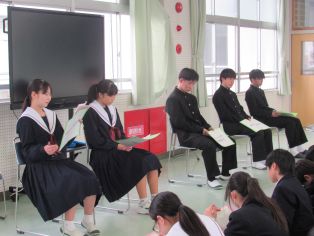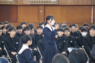 | 1、2年生それぞれで進路学習会が行われました。 2年生は、進路指導主事の先生から実際の受験の流れや注意点などを本年度の受験様子を含め説明してもらいました。 1年生は、本年度卒業した3年生の先輩を講師に招き、なぜその学校を志望したのか、中学校1、2年のころはどのように学校生活を送っていたのか、今後の学校生活では、どんなことを意識して生活するとよいかなど、本校で3年生間過ごし、実際に進路が決まったばかりの先輩だからこそ伝えられる話をたくさん聴くことができました。卒業生からは、今思うともっと早くから受験の準備しておくとよかった。とにかく授業はもちろん課題などにしっかり取り組むことが大切。自分の好きなことを、得意なことを見つけ進路決定につなげるとよいなど、今後に生かせる説得力のあるアドバイスをいただきました。来年の今頃、今の2年生が卒業生として、講師で堂々と語ってくれる姿が今から楽しみです。 卒業生のみなさん本校の伝統をしっかりと受け継ぎ、引き継いでくれてありがとうございました。 |