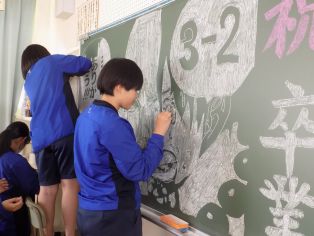 | 1,2年生の実行委員が中心となって、後期の後半から準備してきた3年生を送る会が行われました。1,2年生からは、「3年生に喜んでもらいたい一心で」用意してきた、趣向を凝らしたクイズや寸劇などの出し物、全校生徒で取り組んだ超巨大モザイクアートやメッセージカード、思い出のスライドショーやお世話になった先生方からのビデオレター、会場や教室を彩り、会に花を添える花アーチや飾り、黒板アート、美術部が作製したタイトル看板、入退場を華やかにする吹奏楽の生演奏などが披露されました。会の後半では、3年生から教室で活用できる手作り本棚、ハーモニー歌詞がすてきな「正解」の合唱が贈られました。感動あり、笑いあり、涙ありのすてきな会になりました。 3学年で過ごすのもあと10日となりました。来週からは、いよいよ卒業式に向けた練習が始まります。送る会のときもですが、1、2年生は、3年生から引き継げるものをしっかりと引き継ぎ、三好中学校の伝統を繋いでいきたいですね。 |
