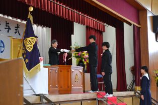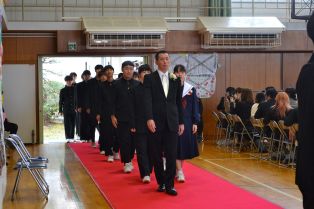 | 正門で地域の方からいただいた紅白のサクラソウが満開に咲き誇り中、79回目の卒業式が行われました。事前に会場に集まった在校生が前日までの練習同様、引き締まった真剣な表情や姿勢で会場の厳かな雰囲気をつくる中、卒業生が堂々と入場しました。証書授与では、支えてくださった方々への感謝とこれからの決意を込めた返事と所作で証書を受け取りました。校長式辞では、卒業生の「自分たちで考え主体的に行動する良さ」や「仲間を思いやり前向きに活動し、後輩のよきお手本となった」ことなど、1年生からの行事など具体的な場面を振り返り称賛する内容が話されました。特に3年生で行った感謝を伝える感伝活動で贈られた色とりどりの折り紙の花束を例に、自分の持ち味を存分に発揮するだけでなく、仲間と協力し、団結させながら学校をリードしてきた功績から学年のテーマである「COLORFUL