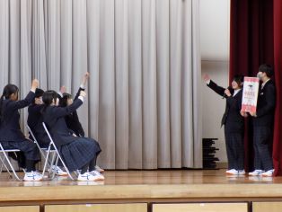 | 午前中に2年生が学年の文化祭を行いました。後期に入ってから、実行委員中心に自分たちで企画、準備を重ねてきました。グループや、学級対抗で楽しむレクリエーションあり、ダンスや歌、楽器やバンドの演奏、劇やものまねなど個人やグループで特技を活かす有志発表ありとみんなが楽しめるさまざまな企画が目白押しで大盛り上がりでした。年度の最後に学級や学年の絆をいっそう強くしたようです。 | ||