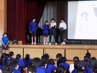 | 一、二、三学級では、これまでお世話になった3年生の卒業を祝う会を行いました。1,2年生が3年生に内緒でそれぞれの実行委員に分かれ、準備をしてきました。体育館でみんなが楽しめるスポーツレクや歌やダンス、ものまねなどの出し物、思い出をまとめたスライドショーなどで3年生をお祝いしました。会の最後には、1,2年生から心のこもたメッセージカードが3年生に渡され、3年生からは、これまでの感謝の気持ちと1,2年生への激励のことばが贈られ、教室中がほっこりした温かい雰囲気に包まれました。 | ||
